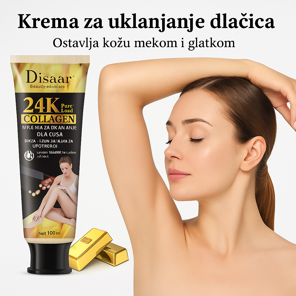 Predstavljamo ti Disaar 24K Gold kremu za depilaciju – revolucionarnu formulu sa zlatnim česticama, kolagenom i hidratantnim biljnim ekstraktima, koja doslovno topi dlačice za samo 5 minuta!